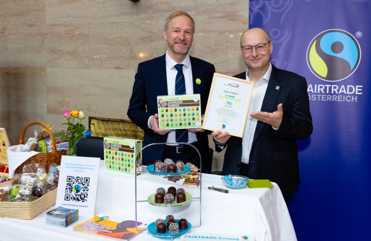 Vor einigen Tagen feierte Niemetz im Rahmen der Fairtrade-Ausstellung im Säulensaal des Parlaments das zehnjährige Jubiläum der Fairtrade-Partnerschaft. Zu diesem Anlass verlieh Hartwig Kirner, Geschäftsführer von Fairtrade Österreich Bernhard Kletzmair, Geschäftsführer von Heidi Chocolat AG Niemetz Schwedenbomben, feierlich die Urkunde.