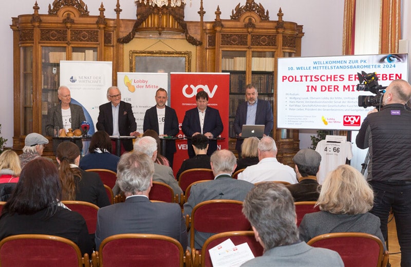Am Dienstag haben der Senat der Wirtschaft (SdW), Lobby der Mitte (LdM) und der Österreichische Gewerbeverein (ÖGV) den zehnten Durchgang ihres sogenannten "Mittelstandsbarometers" präsentiert. Mit den Erkenntnissen dieser repräsentativen Bevölkerungsumfrage, die vom Gallup-Institut durchgeführt wurde, möchten die drei Verbände laut eigenen Angaben die Parteien, Interessenvertretungen und Lobbys bezüglich Mittelstand & Mittelschicht "gerade im großen Wahljahr 2024" zum Umdenken bewegen. Umfrage-Initiator Wolfgang Lusak von LdM sprach im Rahmen der Präsentation von einem "Aufschrei der Mitte".