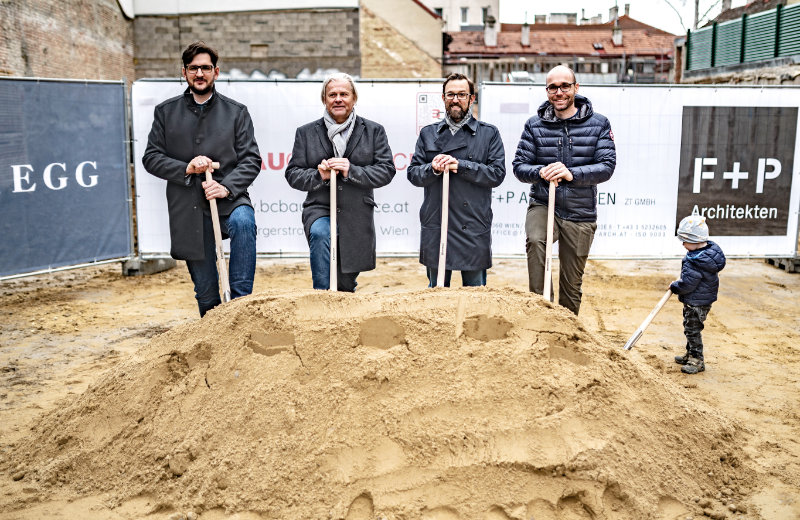 V.l.n.r.: Safet Gül, BauCommerce, Elmar Danner, F+P Architekten, Michael Van Aken und BM Kevin Soemmer © Winegg