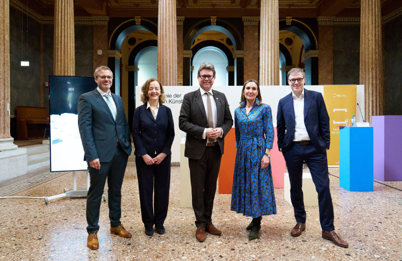 V.l.n.r.: Richard Schöberl, Leiter Unternehmensbereich Universitäten, Bundesimmobiliengesellschaft, Carolin Bohlmann, Institutsleiterin Institut für Konservierung und Restaurierung, Martin Polaschek, Bundesminister für Bildung, Wissenschaft und Forschung, Katja Sterflinger, Institutsleiterin Institut für Naturwissenschaften und Technologie in der Kunst und Johan F. Hartle, Rektor der Akademie der bildenden Künste Wien © Markus Korenjak