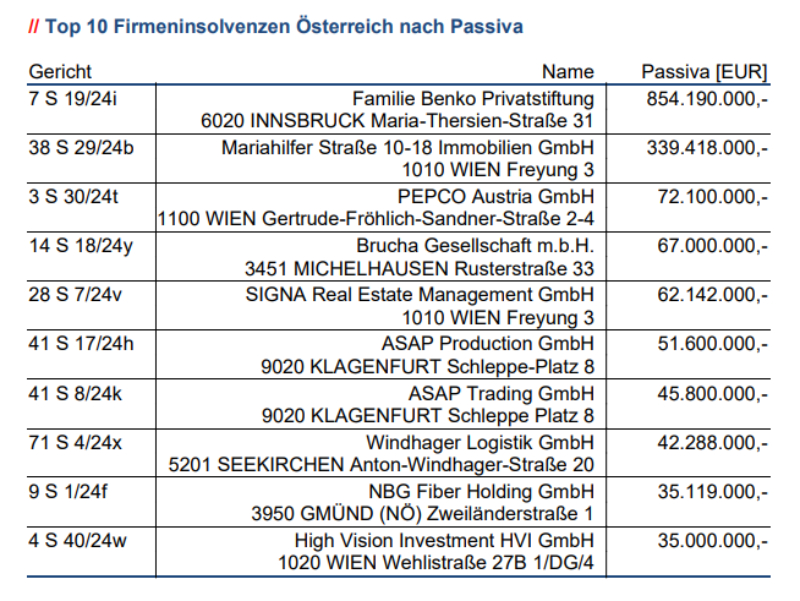 Top 10 Firmeninsolvenzen Österreich nach Passiva © AKV