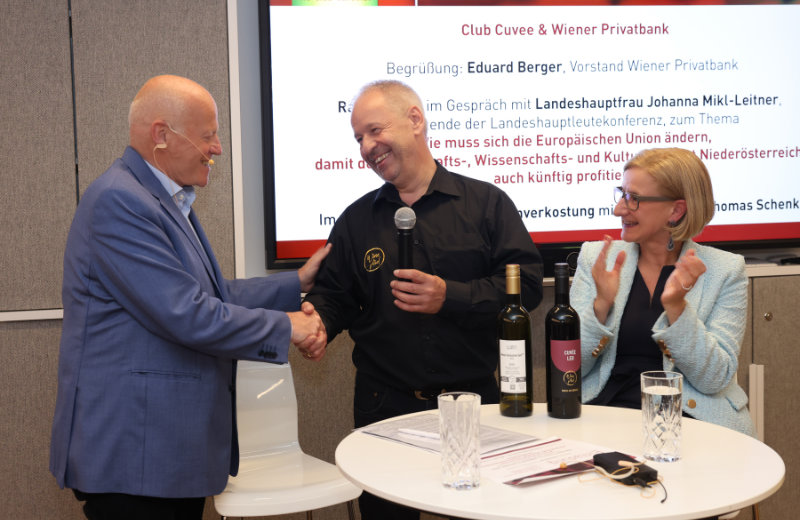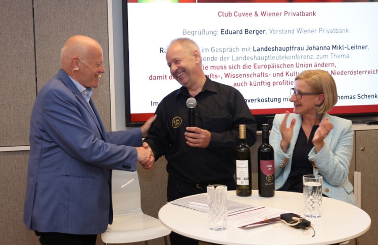 Ralph Vallon lud zum nächsten Club Cuvée. Diesmal war die niederösterreichische Landeshauptfrau Johanna Mikl-Leitner zu Gast bei der Veranstaltungsreihe, die diesmal bei der Wiener Privatbank über die Bühne ging. Nach der Begrüßung von Eduard Berger, Vorstand Wiener Privatbank, interviewte Vallon Mikl-Leitner zu Niederösterreich und der EU.