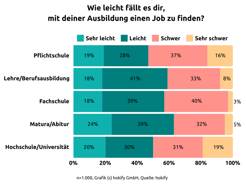 59 Prozent derer, die einen Lehrabschluss haben, geben an, mit ihrer Ausbildung sehr leicht oder leicht einen Job zu finden. Nur acht Prozent geben an, sehr schwer einen Job zu finden. Im Gegensatz dazu geben 18 Prozent der Absolvent:innen einer Hochschule bzw. Universität an, sich mit der Jobsuche sehr schwer zu tun, die Hälfte der Uni-Absolvent:innen findet leicht oder sehr leicht einen Job.
