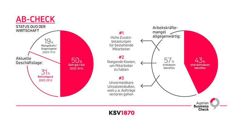 Die Geschäftslage in Österreich gestaltet sich von Branche zu Branche sehr unterschiedlich. Insgesamt bewerten 50 Prozent der in Österreich tätigen Unternehmen ihre Geschäftslage laut aktueller Austrian-Business-Check-Umfrage des KSV1870 mit sehr gut oder gut. Das sind um vier Prozentpunkte weniger als im Frühjahr des Vorjahres. Während 56 Prozent der Industriebetriebe ihre wirtschaftliche Situation positiv bewerten, sind es im Handel (45%) um elf Prozentpunkte weniger.