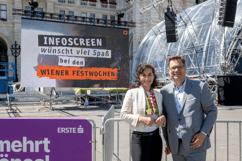 Am Rathausplatz bespielt Infoscreen bei der Eröffnungsfeier zwei große Videowalls mit einem Sonderprogramm, das sich unter anderem aus gängigen redaktionellen Formaten wie "Quiz", "Die Welt in Zahlen", "Für helle Köpfe", "Thema" oder den "Festwochen Daires" zusammensetzt.