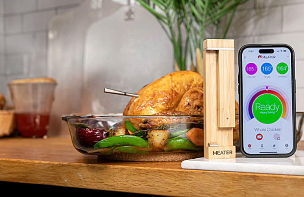 Das Essen spielt natürlich die wichtigste Rolle bei jeder Grillparty - und perfekt gegrillte Speisen gehören dabei zu den größten Herausforderungen. Hier ist das Timing entscheidend. Das Meater 2 Plus Smart-Fleischthermometer hilft dabei, die Kerntemperatur des Grillguts immer im Blick zu behalten. Das kabellose Thermometer sendet die Temperatur des Grillguts via Bluetooth direkt ans Smartphone und schickt eine Benachrichtigung, wenn das Fleisch den idealen Garpunkt erreicht hat. Dank einer Reichweite von bis zu 50 Metern muss dabei niemand dauerhaft am Grill stehen und jedes Steak wird zum Hochgenuss.