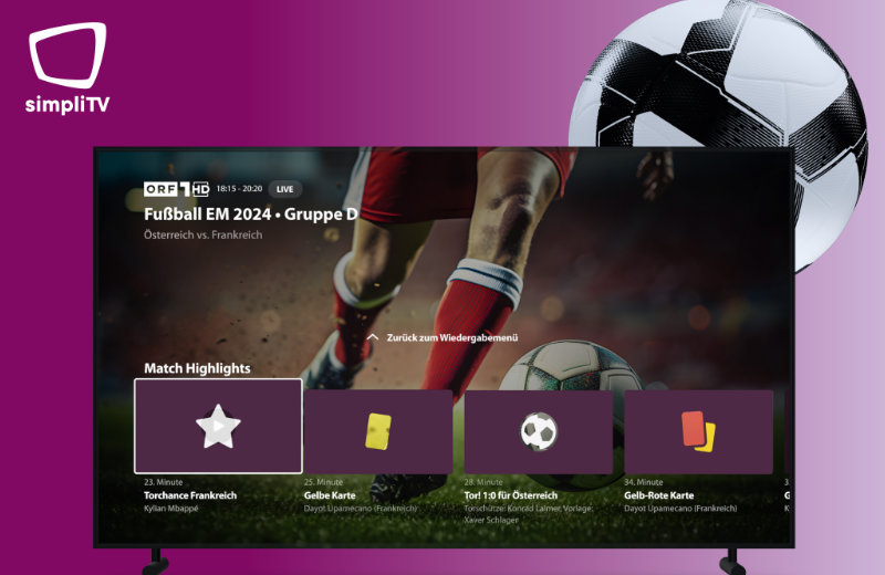 simpliTV bringt pünktlich zum Start der Fußball-Europameisterschaft zudem ein neues Feature in die simpliTV App. Mit den "Match Highlights" können User:innen sämtliche vergangene Highlights wie spielentscheidende Szenen, Tore oder Platzverweise durch rote Karten direkt und zu jeder Zeit nachschauen und alle vergangenen Spiel-Highlights stehen im Überblick und jederzeit zum Nachschauen zur Verfügung.