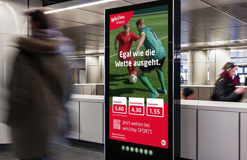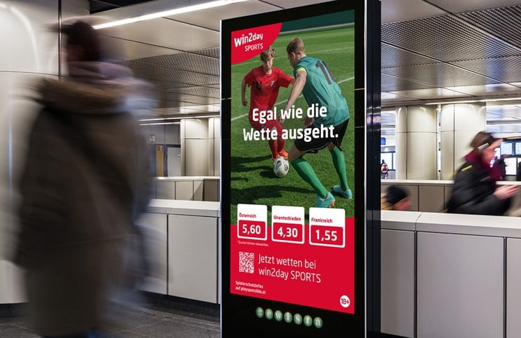 Zeitgerecht zum Auftaktspiel der ÖFB-Elf bei der Fußball-EM am Montag (17. Juni), das leider mit einer knappen 0:1-Niederlage gegen Frankreich endete, hat Gewista für win2day eine Innovation im Bereich der Außenwerbung an den Start gebracht. Bei der sogenannten "Dynamic Content Optimization" (DCO) werden für den Kunden Wettquoten auf den Werbesujets während den Matches laufend aktualisiert. Die Digital out of Home-Werbemittel laufen im Rahmen einer in Zusammenarbeit von Jung von Matt/Donau, Tunnel23 und the-odd konzipierten Kampagne.