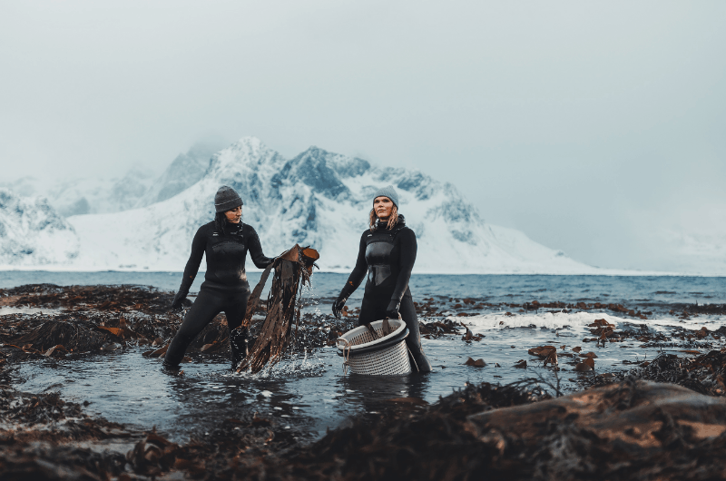 Tamara und Angelita stehen schon seit drei Stunden im hüfthohen Wasser. Selbst der sieben Millimeter dicke Wetsuit schützt nur dürftig vor der eisigen Kälte des Nordmeers, doch die Erntesaison ist kurz: Etwa acht Wochen lang ernten sie Meeresalgen vor der Küste der norwegischen Lofoten – und das ist hier einzigartig. Zwar sprießen Algenfarmen in Norwegen gerade wie Pilze aus dem Boden, doch das händische Ernten von wild wachsenden Algen ist selten. "Da ist so viel mehr im Wasser als nur Fische", sagt Tamara. Als Neuseeländerin mit japanischen Wurzeln waren Algen schon immer fixer Bestandteil ihres Speiseplans.