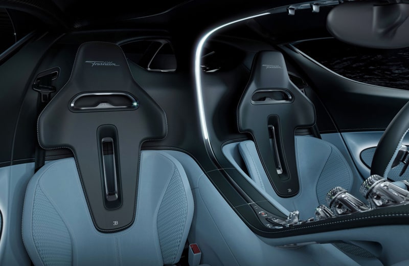 Damit sind wir auch schon beim komplett auf Luxus und Hochwertigkeit getrimmten Innenraum, der entgegen dem Trend der Massenhersteller völlig ohne sichtbares Riesen-Display auskommt. Die nachvollziehbare Begründung lautet: "Mit der Vision, dass der Tourbillon nicht nur in 10, sondern auch in 100 Jahren auf dem Rasen des 'Concours d'Elegance' zu sehen sein wird, wurde die Designphilosophie des Interieurs auf Zeitlosigkeit ausgerichtet." Als Inspiration diente das Handwerk der Uhrmacherei. Herzstück ist ein Kombiinstrument, das in Zusammenarbeit mit Schweizer Uhrmachern entworfen und gebaut wurde. Es besteht laut Bugatti aus über 600 Teilen und ist aus Titan sowie Edelsteinen wie Saphir und Rubin gefertigt. Dieses aufwendig hergestellte Werk bietet noch einen absoluten Höhepunkt, der erst bei der Betätigung des Volants erkennbar ist. Es bleibt nämlich stets im Zentrum des Fahrers, da es feststeht, während sich der Lenkradkranz darum herum dreht – eine Anordnung, die als Lenkrad mit feststehender Nabe bekannt ist. Dank dieses Konzepts hat der:die Fahrer:in im Tourbillon stets eine klare Sicht auf die Instrumente, unabhängig vom Lenkeinschlag, da die Speichen um die Rückseite der Instrumententafel herumgeführt werden.
