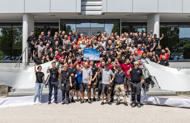 Im Juni 2024 konnte die FACC das 2000. Airbus-Flugzeug mit Sharklets ausstatten. Die nach oben gebogenen Flügelspitzen sollen dazu beitragen, den Treibstoffverbrauch eines Flugzeuges signifikant zu reduzieren. © FACC