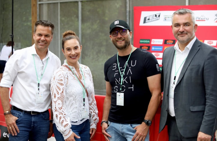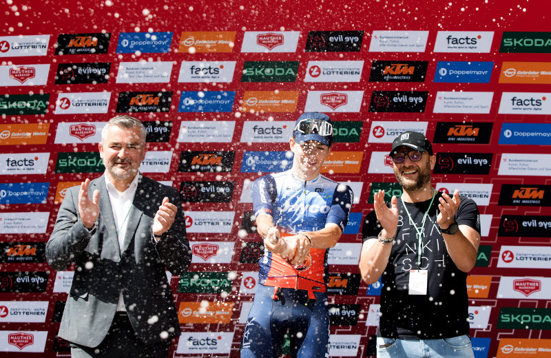 Heinrich Dorner (links) und Horst Gager (rechts) gratulierten dem Italiener Davide De Pretto (Mitte) zum Sieg der 1. Etappe der 73. Tour of Austria in Bad Tatzmannsdorf. © Landesmedienservice Burgenland/Daniel Fenz