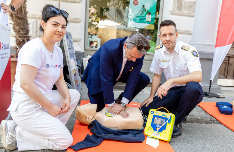 Mario Krammel, Chefarzt der Berufsrettung Wien und geschäftsführender Präsident von Puls, dem Verein zur Bekämpfung des plötzlichen Herztodes, erklärt die Hintergründe: "Medizinisch gesehen wissen wir, dass in puncto Überlebenschancen bei einem Herzstillstand tatsächlich jede Sekunde entscheidend sein kann. Aktuell liegt die Überlebensrate in solchen Fällen in Wien bei rund 20 Prozent. Durch rasches Eingreifen eines:r Ersthelfers:in noch vor Eintreffen der Rettung könnten bis zu 70 Prozent der Betroffenen überleben. Im Notfall gilt daher: Rufen – Drücken – Schocken. Also Notruf 144 wählen, Herzdruckmassage ausüben und dann den Defi einsetzen. Man kann nichts falsch machen. Nur Nichtstun ist falsch."