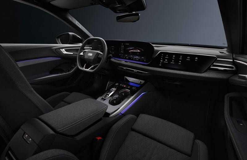 Das Interieur des neuen A5 orientiert sich optisch stark am ebenfalls brandneuen Elektro-SUV Q6 e-tron. Highlight ist das sogenannte "MMI Panoramadisplay" im gebogenen Design und in OLED-Technologie ausgeführt. Es besteht aus dem mehrfach anpassbaren Kombiinstrument (virtual cockpit) mit 11,9 Zoll Bildschirmdiagonale und dem 14,5 Zoll großen Touchscreen. Wie im Q6 e-tron gibt es optional ein 10,9 Zoll großes Beifahrerdisplay, das nahtlos in das Schalttafeldesign integriert ist. Laut Audi verfügt der A5 über ein im Vergleich zum Vorgänger weiterentwickeltes, konfigurierbares Head-up Display. Die fahrende Person soll damit erstmals die Möglichkeit haben, Fahrzeug- und Infotainmentfunktionen über das HuD zu steuern. Natürlich ist der A4-Nachfolger auch komplett vernetzt und auf Wunsch mit so gut wie allen derzeit erhältlichen Assistenzsystemen zu haben. Zudem soll die sogenannte E³-Elektronikarchitektur für eine intuitive Bedienung sorgen und über eine äußerst verständliche Sprachsteuerung verfügen.