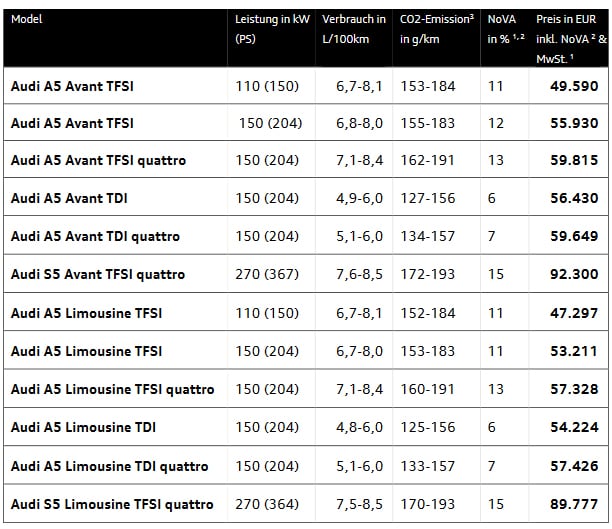 Bis der Nachfolger des mittlerweile ziemlich in die Jahre gekommenen A4 in den Handel kommt, ist noch etwas Geduld gefragt. Laut Audi werden der A5 und der S5 im November in Österreich auf den Markt kommen. Der A5 startet hierzulande als Limousine TFSI 110 kW mit einem Einstiegspreis ab 47.297 Euro, der in Österreich tendenziell besonders beliebte Avant (erwarteter Marktanteil von 90 Prozent) mit der gleichen Motorisierung ab 49.590 Euro. Die Basis-Version serienmäßig unter anderem über Navigation, eine elektrische Heckklappe und eine Telefonablage mit induktiver Ladefunktion. Hinsichtlich der Motorisierungen geht Audi Österreich beim 40 TDI vom höchsten Anteil aus, gefolgt vom TFSI 110 kW.