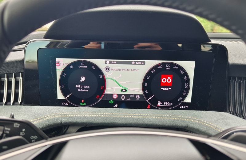 Obwohl es sich bei unserem Triebwerk um den Basisantrieb handelt, fühlte sich das Fahrzeug keineswegs untermotorisiert an. Mit 1,6 Tonnen ist der fast fünf Meter lange Superb Combi - in Zeiten von fast drei Tonnen schweren E-Autos - auch nicht allzu schwer. Wie es mit dem Vortrieb bei Vollbesetzung und rappelvollem Kofferraum aussieht, können wir jedoch nicht sagen. Beim starken Beschleunigung macht sich der 150 PS Benziner akustisch zwar bemerkbar, spielt sich aber nicht in den Vordergrund und dank des Mildhybridsystems gibt es einen E-Boost, der das Turboloch nahezu komplett überdeckt. Noch positiver macht sich die Elektrounterstützung aber beim Verbrauch bemerkbar, der bei unserem Test trotz eines Autobahnanteiles von mehr als 80 Prozent unter sechs Liter geblieben ist. Vor noch nicht allzu langer Zeit wäre das nur mit einem Diesel möglich gewesen. Hier scheinen Direktschaltgetriebe inklusive Segelfunktion, Antriebsstrang und Aerodynamik bestens miteinander zu harmonieren. Das Fahrwerk ist auf der komfortablen Seite angesiedelt, ohne schwammig zu wirken. Dank des langen Radstandes werden Bodenwellen weitestgehend absorbiert und wenn es einmal etwas flotter um die Ecken gehen soll, schärft der Sport-Modus Lenkung, Fahrwerk und Gasannahme nach.