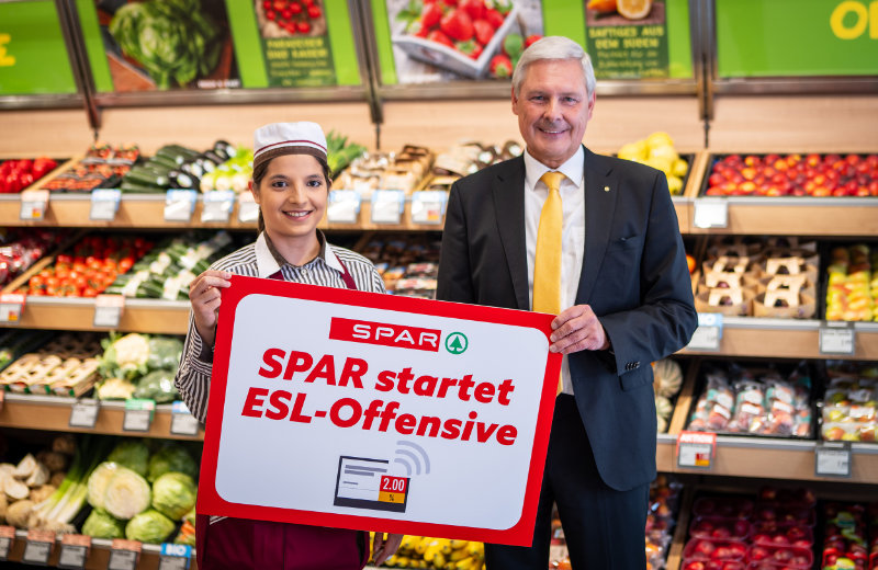 Spar-Vorstandsvorsitzender Hans K. Reisch und die Spar-Mitarbeiter:innen freuen sich über den Start der ESL-Offensive bei Spar. © Spar/Fischler