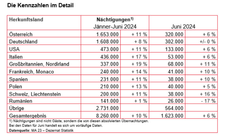 Die Liste der nächtigungsstärksten Märkte der Bundeshauptstadt in den ersten sechs Jahresmonaten führt Österreich (1.653.000, +11 Prozent zu Jänner bis Juni 2023) knapp an, gefolgt von Deutschland (1.608.000, +8 Prozent). Die Vereinigten Staaten von Amerika haben sich als stärkster Fernmarkt mit 473.000 Nächtigungen (+11 Prozent) wieder auf Platz drei der Top-10-Herkunftsmärkte Wiens etabliert. Italien (436.000, +17 Prozent), Großbritannien (337.000, +19 Prozent), Frankreich (240.000, +14 Prozent), Spanien (231.000, +11 Prozent), Polen (210.000, +13 Prozent), die Schweiz (200.000, +11 Prozent) und Rumänien (141.000, +1 Prozent) komplettieren die Top-10. Mit insgesamt 1.623.000 Nächtigungen (+6 Prozent) trug der Juni zu diesem Ergebnis bei.