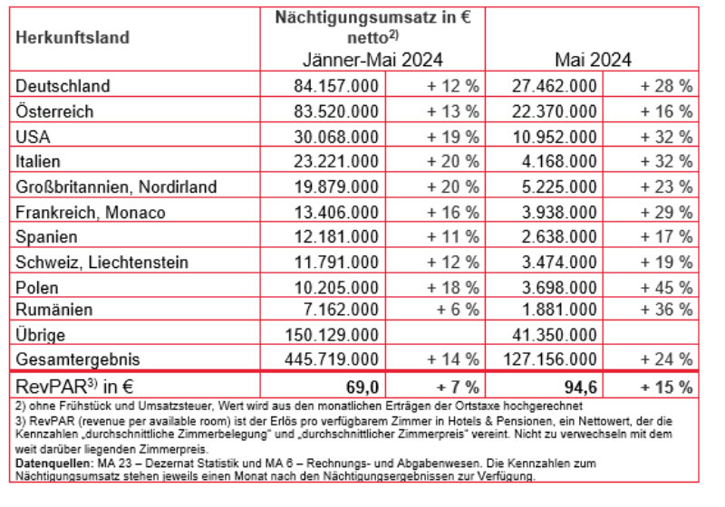 Wien erreichte mit 8,3 Millionen Gästenächtigungen im ersten Halbjahr 2024 ein Plus von zehn Prozent im Vergleich zum Vorjahr. Der Juni verzeichnete 1,6 Millionen Nächtigungen (+6 Prozent). Der Nächtigungsumsatz der Wiener Beherbergungsbetriebe liegt erst für den Zeitraum Jänner bis Mai vor. Mit 445,7 Millionen Euro liegt er um 14 Prozent über dem Vergleichszeitraum 2023.