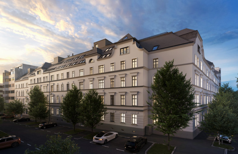 Zum Innenhof wird das bestehende Gebäude um etwa ein Drittel mit einem modernen Neubau erweitert und durch die zusätzlich geschaffenen Dachgeschosse soll dieses Projekt eine außergewöhnliche Vielfalt an Wohnungstypen bieten. © Winegg/Real Agency