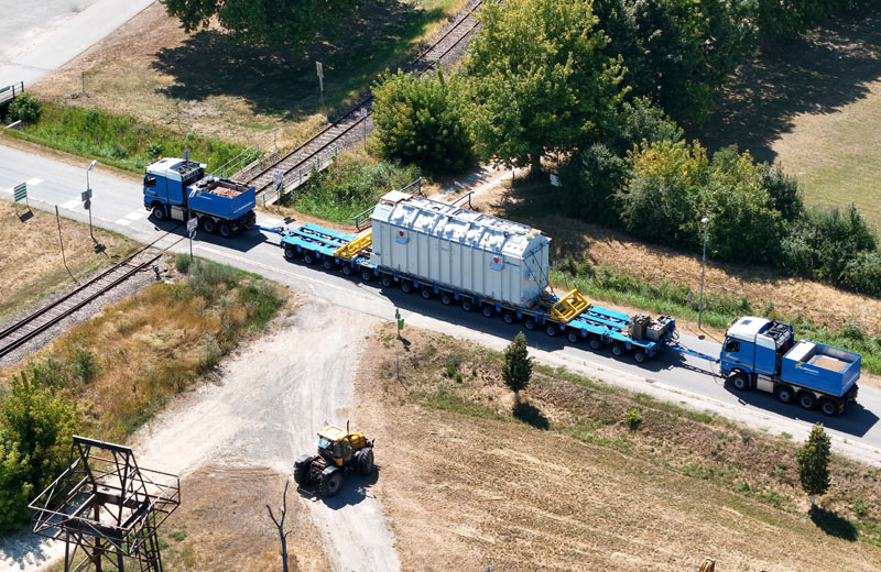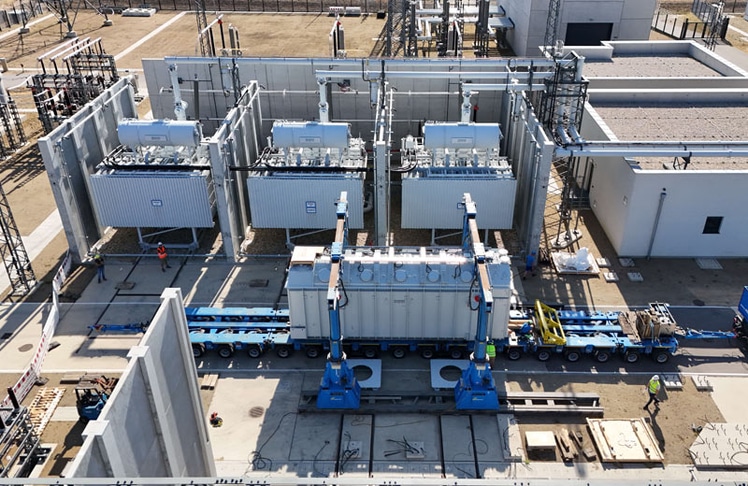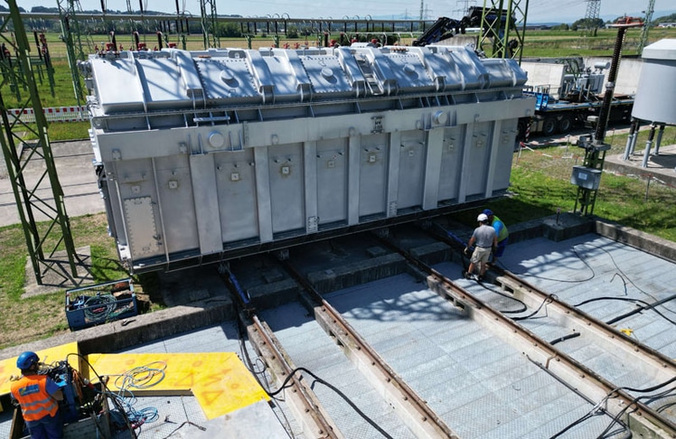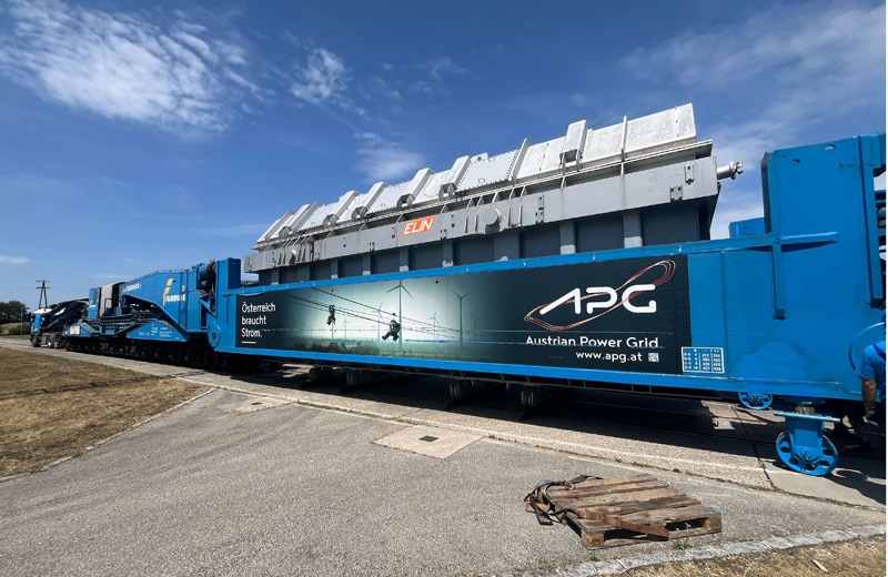 Die ersten beiden 380/110-kV-Trafos mit einer Leistung von je 300 Megavoltampere (MVA) sowie einer Länge von etwa 13 und einer Höhe von knapp zehn Metern wurden bereits in der zweiten Jahreshälfte 2021 ins damals noch in Bau befindliche Umspannwerk Zaya geliefert. Drei Jahre später ist das Trio nun komplett: Am 27. Juli begann der Bahntransport des rund 300 Tonnen schweren, dritten Riesentrafos – vom Siemenswerk in Weiz nach Hohenau an der March. APG-Projektleiter Bernhard Joksch beschreibt die letzte Etappe: "Vom Bahnhof ging es am 30. Juli die letzten zehn Kilometer per Sondertransport über den Straßenweg ins APG-Umspannwerk in Neusiedl an der Zaya. Tags darauf wurde der Trafo schließlich abgeladen und mithilfe von Führungsschienen Millimeter für Millimeter auf sein Fundament gezogen – Präzisionsarbeit, die einen halben Tag in Anspruch nimmt."