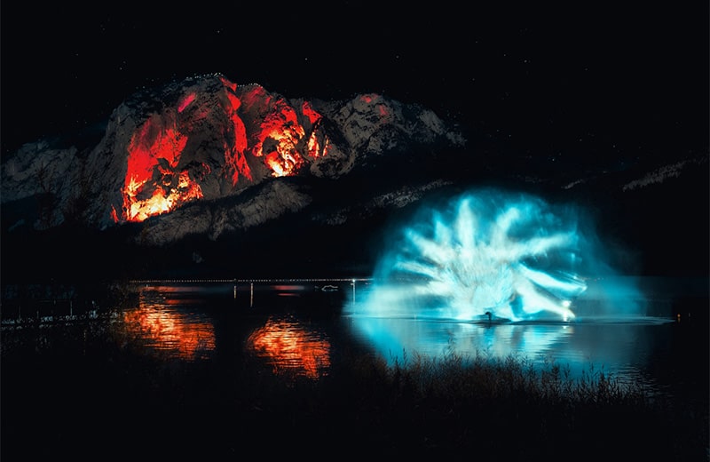 Den Auftakt machten die Grat- und Bengalbeleuchtung, die den Loser und die Trisselwand zu dramatischer Musik in mystisches Rot tauchten, möglich gemacht von den vielen Freiwilligen der Bergrettung Bad Aussee, Altaussee und Grundlsee. Den krönenden Abschluss bildete die Installation "ur/sprung", eine Projektion kreiert von dem Künstlerkreativ OchoReSotto, die mit ihrer Installation eine Hommage an den Ort, seine Schönheit und die Schutzwürdigkeit der malerischen Landschaft schufen. Die Komposition des Multiinstrumentalisten und Produzenten Wolfgang Lehmann trug maßgeblich zur magischen Atmosphäre bei. Seine Musik, die geschickt regionale Elemente aufgriff, unterstrich die visuelle Pracht und verstärkte die emotionale Wirkung der Installation.