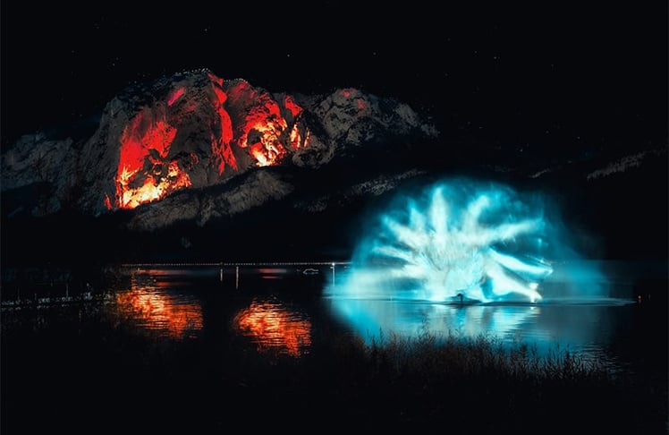 Am 10. August erlebte Altaussee einen Abend, der den im Seepark anwesenden Gästen noch lange in Erinnerung bleiben wird. Klanglicht Graz präsentierte, im Rahmen der Veranstaltung "Berge in Flammen", die ortsbezogene Video- und Klanginstallation "ur/sprung" des steirischen Künstlerkollektivs OchoReSotto.