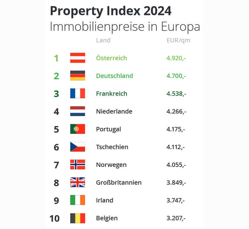 Im europäischen Ländervergleich führt Österreich das Ranking der an der Studie teilnehmenden Länder an. Beim Städtevergleich zeige sich jedoch ein anderes Bild: Paris ist mit 14.900 Euro pro Quadratmeter der Analyse zufolge die teuerste Stadt - damit müssten die Menschen dort mehr als das Dreifache vom Landesdurchschnitt für eine neue Wohnung auf den Tisch legen. Mit 10.900 Euro liegt München auf Platz 2 und mit 8.018 Euro pro Quadratmeter Londons Innenstadt auf Platz 3.