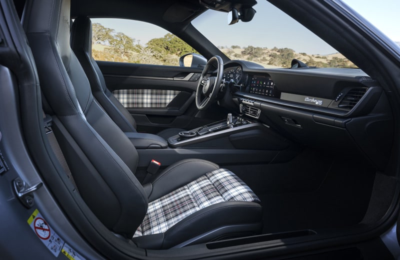 Im Interieur möchte das Jubiläumsmodell ebenfalls an die Turbo-Historie erinnern. Als Hommage an die frühen 911 Turbo Modelle ziert das Schottenkaro "McKenzie" die Mittelbahnen der Sitzbezüge und die Türinnenverkleidungen. Zudem gibt es auch innen Kontraste in Turbonit. Dazu zählen Sicherheitsgurte, Bedienelemente, Ziernähte, Zierleisten mit Dekoreinleger in schwarzem Leder und das Porsche-Wappen auf dem GT-Sportlenkrad. Ein beleuchteter "turbo 50"-Schriftzug findet sich in den in schwarz gebürstetem Aluminium ausgeführten Türeinstiegsleisten. In die Kopfstützen der adaptiven Sportsitze Plus ist der Schriftzug eingestickt. Auf der Rückseite des linken Rücksitzes befindet sich ebenfalls ein "turbo 50"-Schriftzug Über dem Handschuhfach ist eine Jubiläumsplakette aus Aluminium angebracht. Sie zeigt neben dem Schriftzug die individuelle Limitierungsnummer des Supersportwagens. A-Säule, Sonnenblenden und Dachhimmel sind mit perforiertem "Race-Tex" (ähnelt Alcantara) bezogen. Eine analoge Porsche Design Uhr mit spezifischem "turbo 50"-Design auf der Schalttafel rundet die Besonderheiten im Cockpit ab.