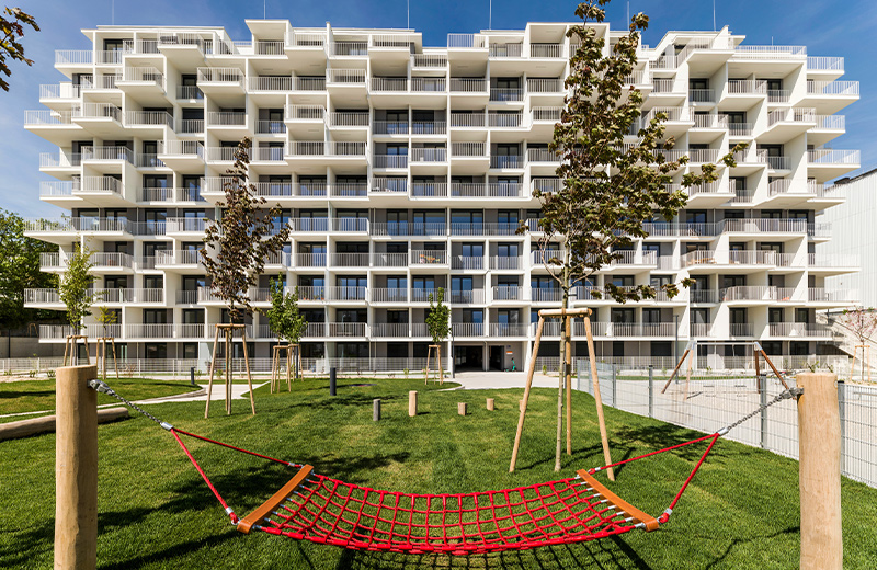 Neben dem privaten Wohnraum offeriert das Projekt viel Platz für Gemeinschaft und die Möglichkeit, durch Nutzung der unterschiedlichen Allgemeinflächen, die eigene Wohnung quasi zu „erweitern“. Alle Wohnungen sind mit Freiflächen ausgestattet, besonderes Highlight ist aber die Dachterrasse des 11-geschossigen Projekts: Dort genießen Bewohner:innen nicht nur einen beeindruckenden Rundumblick über die Stadt, sondern haben zudem die Möglichkeit, Urban-Gardening-Flächen zu nutzen, in der offenen Küche BBQ-Feste mit Nachbarn, Familie und Freunden zu feiern oder im eigens eingerichtetem Yoga-Bereich zu entspannen.
