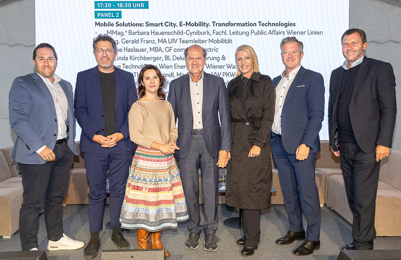 Im zweiten Panel ging es im vie-mobility Forum um "Mobile Solutions: Smart City. E-Mobility. Transformation Technologies" zu den Umsetzungen bei den E-Fahrzeugen & Ladestationen, bei Smart City und dem öffentlichen Verkehr in Wien und bei der Energiewende, insbesondere zum Status quo und einem Blick in die Zukunft. Moderiert von Mario Rohracher, Generalsekretär GSV und langjähriger Partner der vie-mobility, wurde mit Gerald Franz von der Urban Innovation Vienna (UIV), der Klima und Innovationsagentur der Stadt Wien, begonnen. Gerald Franz sah für die lebenswerteste Stadt der Welt auch die Smart City verantwortlich, "weil soziale Überlegungen, Umweltfaktoren und technologische Assets von großer Bedeutung für eine lebenswerte Stadt sind." Hier spiele der öffentliche Verkehr und innovative Lösungen z. B. im Energiebereich eine entscheidende Rolle. Nur mit einer entsprechenden Energie- und Mobilitätswende seien die Klimaziele bis 2040 zu erreichen, um in Wien CO₂-neutral zu werden, was gleichzeitig bedeute, dass die Emissionen im Verkehr, die zu einem Drittel für den CO₂-Ausstoß verantwortlich sind, deutlich reduziert werden müssen. Das funktioniert mit der Nutzung von U-Bahn, Straßenbahn und E-Autos sowie E-Fahrräder und der Umstellung der Busse auf E- und Wasserstofffahrzeuge sowie dem Ausbau von Schnellladestationen in Wien. Barbara Hauenschild-Cyniburk, Public Affairs Wiener Linien, sah die notwendige elektrische Veränderung bzw. die Wasserstoffausrüstung bei den Bussen als wichtig an, allerdings 80 Prozent der Wiener Linien Kund:innen sind schon jetzt mit den öffentlichen E-Fahrzeugen der U-Bahn und Straßenbahn unterwegs. Der Ausbau der E-, Hybrid und Wasserstoffbusse werde in den nächsten beiden Jahren deutlich forciert und so werden ca. 80 Busse CO₂-neutral auf den diversen Linien fahren, die enge Kooperation mit den Wiener Stadtwerken sei hier von großem Vorteil für die Umsetzung im eigenen Haus.