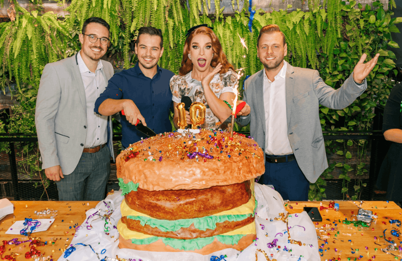 Ausgegeben wurden 111 Cheeseburger für die 111 ersten Kund:innen in 18 Lokalen des Unternehmens – in Summe wanderten so 2.000 Burger zur Feier des Tages über den Tresen. Auch prominente Unterstützung war zugegen. So schnitten im Flagship-Restaurant Drag Queen und Dancing Star Tamara Mascara, Le Burger-Gründer Thomas Tauber und sein Sohn Lukas die 100 Kilogramm schwere Burger-Torte an und halfen beim Verteilen der Gratis-Burger.