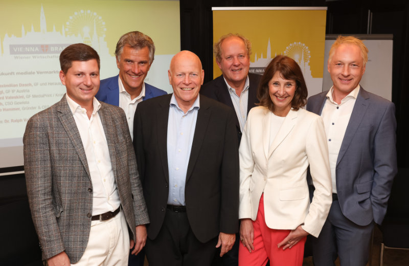 Bei der zweiten Runde "Zukunft medialer Vermarktung" diskutierten Maximilian Dasch, VÖZ Präsident und Herausgeber der Salzburger Nachrichten, Andrea Groh, CSO Gewista, Gerhard Valeskini, Geschäftsführer Mediaprint/Kronen Zeitung, Walter Zinggl, Geschäftsführer IP Austria und Kraftwerk-Agenturchef Heimo Hammer. Die Moderation übernahm Ralph Vallon.
