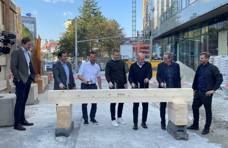 V.l.n.r.: Sebastian Leutzendorff (ZBI Gruppe), Filip Rosa (ZBI Gruppe), Matthias Waibel (STC Development GmbH), Sebastian Wahl (RoomBuus Gruppe), Joachim Pawelka (RoomBuus Gruppe), Architekt Jörg Stögmüller und Architekt Martin Kneidinger beim traditionellen "Nageln" auf der Gleichenfeier © STC Development