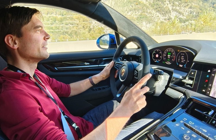 Bei der Rückreise an Tag zwei nahm LEADERSNET am Steuer eines Panamera 4S E-Hybrid Platz. Die rund fünf Meter lange Limousine ist als sportliche Alternative zu Mercedes S-Klasse, Audi A8 und BMW 7er positioniert. Während sich optisch bei der neuen Generation nicht allzu viel getan hat, ist im Innenraum und unterm Blech kein Stein auf dem anderen geblieben. Die Materialgüte und Verarbeitungsqualität entspricht – wie auch im Macan – den höchsten Ansprüchen. Wie bei den reinen Stromern gibt es optional auch hier nun ein drittes Display für den:die Beifahrer:in. Dank der deutlich tieferen Sitzposition erinnert der Panamera deutlich stärker an einen Sportwagen als der Macan. Technisches Highlight ist sein innovatives Aktivfahrwerk namens "Porsche Active Ride", das extra zu bezahlen ist. Dabei verfügt jeder Stoßdämpfer über eine elektrisch betriebene Hydraulikpumpe, mit der er aktiv Kräfte in Zug- oder Druckrichtung aufbauen kann. Auf diese Weise fängt das Fahrwerk durch Fahrbahnanregungen ausgelöste Karosseriebewegungen nahezu vollständig ein und hält den Porsche bei dynamischen Fahrmanövern stets horizontal. Das wirkt schon fast etwas gespenstig – vor allem beim Beschleunigen und Bremsen. Zudem bietet das Fahrwerk auch einen echten Komfortgewinn. Es hebt die Karosserie beim Ein- und Aussteigen um mehrere Zentimeter an.