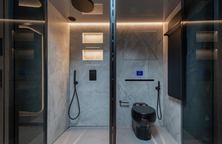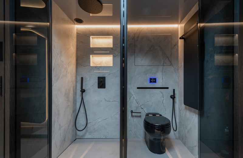 Dem hohen Anspruch der solventen Kund:innen entsprechend gibt es zwischen Schlaf- und Wohnabteil auch ein luxuriöses Bad in edlem Naturstein mit Regenwalddusche, WC und Waschbecken.