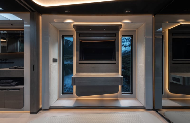 Die beiden ausgefahrenen Module im Schlafabteil schaffen Platz für das quer platzierte Doppelbett im Format 160 x 200 Zentimeter. In die Rückwand des Motorhomes ist ein großer Kleiderschrank integriert. In der dem Bett gegenüberliegenden Seitenwand sind ein Schreibtisch und ein 43-Zoll-4K-Fernseher installiert, auf dem man, wie auch auf einem identischen Gerät im Salon, nicht nur TV-Programme sehen oder auf der Playstation 5 spielen kann. Dank Satelliten-Internet via Starlink (von Elon Musk) sollen die Passagiere in diesem mobilen Eigenheim selbst in entlegenen Gegenden Streamingdienste sehen, Content aus dem Internet abrufen oder mit der ganzen Welt kommunizieren können.