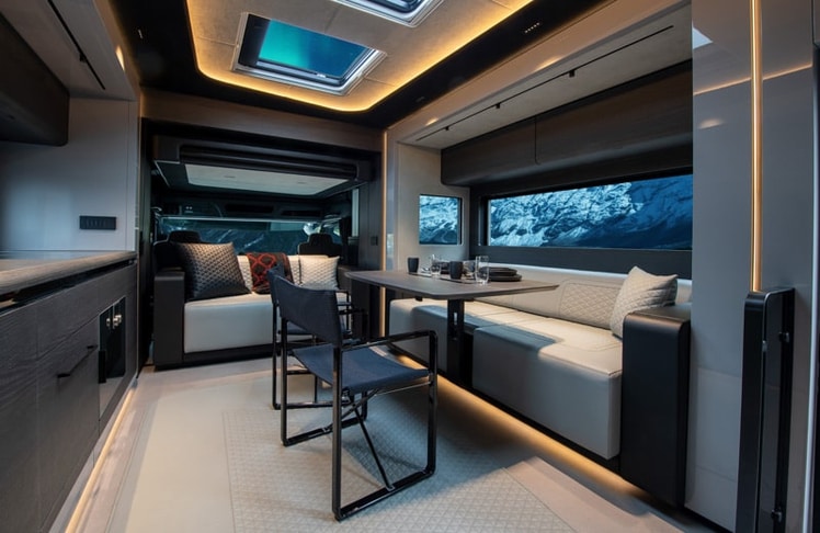 Im Salon ist außerdem eine moderne Küche mit Induktionskochfeld, Backofen, Geschirrspüler und geräumigem Kühlschrank mit Gefrierfach integriert. Für Getränke gibt es dort auch einen separaten Weinkühlschrank und eine Kaffeemaschine. Das gegenüber der Küche platzierte Sofa kann zusammen mit Designerstühlen, die mit schwarz-grauem Stoff gepolstert sind, und einem großen, schwarzen Tisch zum Teil eines Esszimmers werden. Laut Brabus könne dieses Ensemble aber auch ebenso als Arbeitsplatz im Mobile Office genutzt werden.