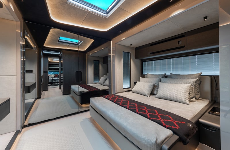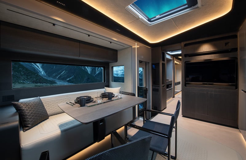 Das extravagante, außen komplett in Schwarz gehaltene Reisemobil besitzt auf jeder Seite zwei elektrisch ausfahrbare Slide-Outs, die Schlafzimmer und Salon auf 4,50 Meter Breite vergrößern können. Hydraulisch ausfahrbare Stützen nivellieren das Fahrzeug automatisch und sollen so selbst auf unebenem Grund für einen sicheren Stand sorgen. Für den Ein- und Ausstieg zur Passagierkabine gibt es auf der rechten Seite des Salons eine Tür mit elektrisch ausfahrbarer Treppe.