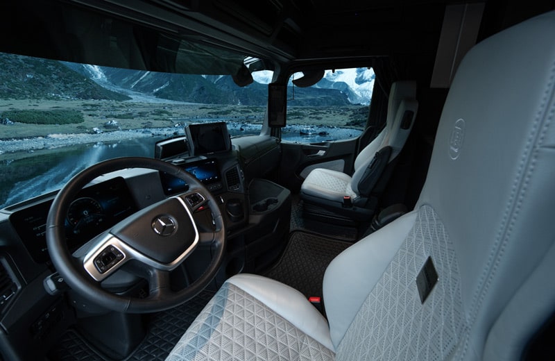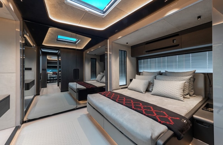 Im Fahrerabteil mit zwei eigenen Türen gibt es zwei große Sitze, die ebenfalls mit grauem Leder gepolstert sind. Sie sind nicht nur im Triangle-Design abgesteppt, sondern auch perforiert. Direkt über dem Cockpit ist ein elektrisch absenkbares, 160 Zentimeter breites Bett installiert. Gardinen schirmen das Cockpit bei Bedarf von der Außenwelt und dem Salon ab.