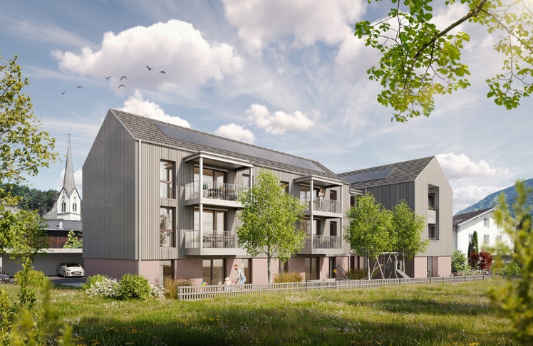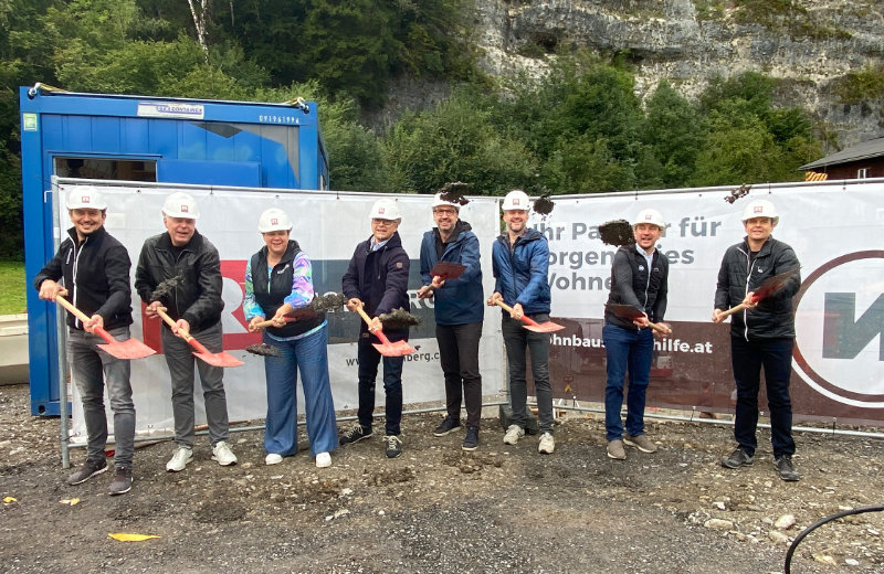 V.l.n.r.: Martin Kohler (Rhomberg Bau), Gemeindevorstand und Obmann des Gesundheits- und Pflegeausschusses Reinhard Bacher, Vizebürgermeisterin Elke Zimmermann, Thomas Schöpf (Geschäftsführer WS), Architekt Marcus Ender, Bauamtsleiter Thomas Graß, Josef Jenny (WS) und Christian Jauk (Rhomberg Bau) © Rhomberg Bau