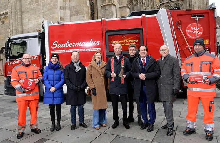 Der neue Saubermacher E-Hecklader hebt die umweltfreundliche Entsorgung von Gewerbeabfällen in Wien auf ein neues Niveau. Bis zu 60 Tonnen CO2-Emissionen spart der leise "Stromer" jährlich im Vergleich zu einem mit Diesel betriebenen Fahrzeug ein. Ein technisches Highlight: Der LKW ist mit dem Saubermacher Wertstoffscanner ausgestattet. Dieser erkennt mittels KI Fehlwürfe im Abfall. Ein 55-Zoll-Display ziert zudem die Außenwand des Lasters. Darüber hinaus ist er mit einem lebensrettenden Defibrillator ausgestattet. Der E-Müll-LKW wurde am Mttwochvormittag von Dompfarrer Toni Faber auf dem Wiener Stephansplatz geweiht.