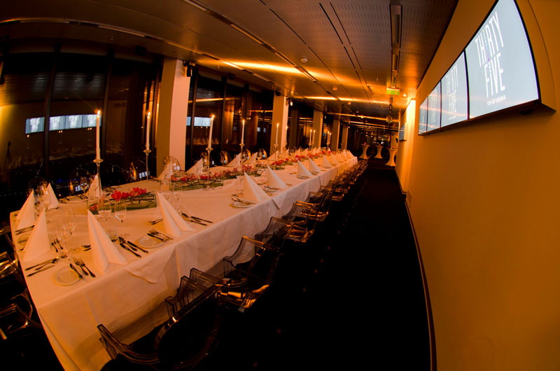 Ob Pressekonferenz, Präsentation, Cocktailempfang, Seminar, Kongress, Businesstalk, Galadinner oder Weihnachtsfeier das ThirtyFive ist für jede Art von Event bestens gerüstet. Die 600 m² große Veranstaltungslocation befindet sich in der Top-Etage der Vienna Twin Tower. Aufgrund der Dimension ist „die längste Tafel der Stadt“ für bis zu 160 Personen möglich und alle Gäste nehmen an einem einzigen Tisch Platz.