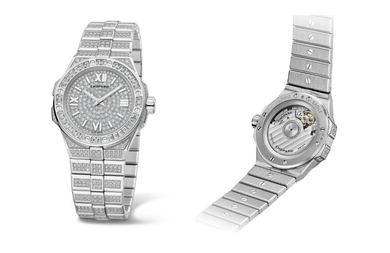 Die Alpine Eagle ist eine moderne, sportlich-schicke Kollektion, in der Chopard schlichtes Design mit raffinierter Mechanik verbindet. Mit dem neuen Modell, mit einem Durchmesser von 33 Millimetern, wird die Kollektion um eine Neuheit erweitert, in der sich die Uhrmacherkunst des Hauses mit den Kompetenzen der Schmuckfertigung vereint. Inspiriert von der Schönheit der Natur erinnert diese funkensprühende Uhr an glitzernde Eiskristalle auf einem Gletscher: Gehäuse, Lünette, Zifferblatt und das integrierte Armband sind in 18 Karat Ethischem Gold gefertigt und mit Diamanten besetzt.