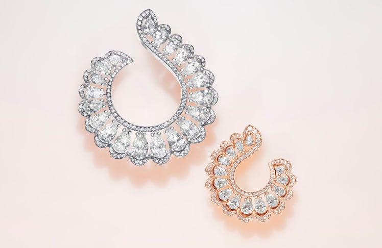 Mit der Precious Lace Kollektion hat Chopard die Haute Joaillerie um ein ausdrucksvolles Design mit zart durchbrochenen Motiven bereichert. Edelsteine und Ethisches Gold werden zu Schmuck, der sich wie Haute Couture an den Körper schmiegt und mit der Aura feiner Spitze eine feminine Silhouette modelliert. Nach dem Erfolg von runden Ohrringen mit zartem Wellenmuster gibt es die eleganten Schmuckstücke nun in einer neuen Größe und in den Farben der vier kostbarsten Edelsteine.