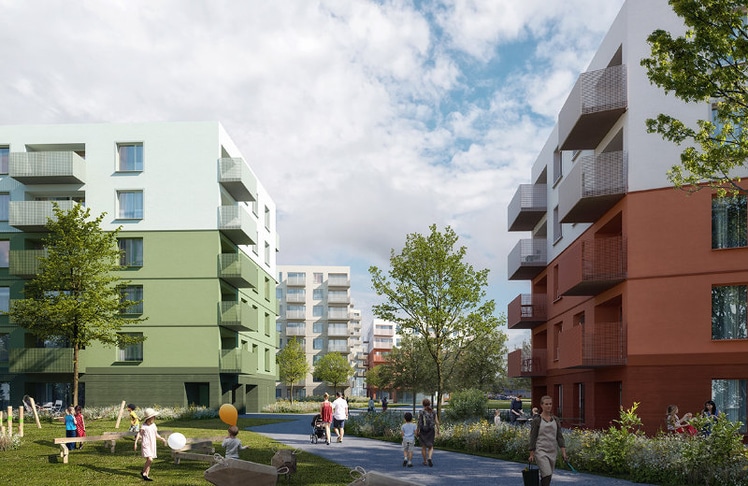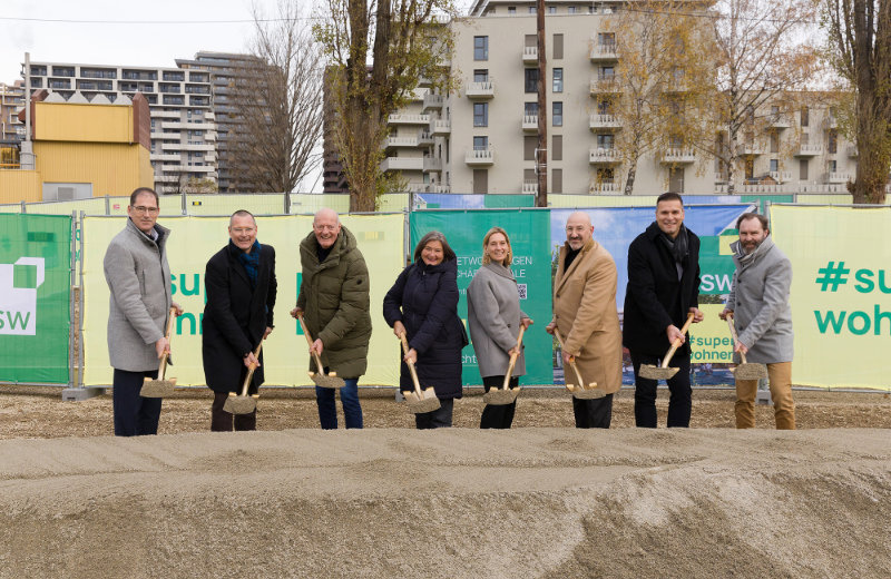 V.l.n.r.: Sascha Risavy, Leitung Baumanagement ÖSW AG, Eckehart Loidolt, Geschäftsführender Gesellschafter schneider+schumacher, Wolfgang Wahlmüller, Generaldirektor ÖSW Konzern, Karin Gruber, Bezirksvorstehung Eggenberg, Birgit Leinich, Geschäftsführung ÖSW Wohnbauträger GmbH, Markus Fichta, stv. Generaldirektor ÖSW Konzern, Stefan Lipp, Niederlassungsleiter Porr AG, und Gerald Parzer, Leitung Projektentwicklung ÖSW AG © Lipp Zahnschirm