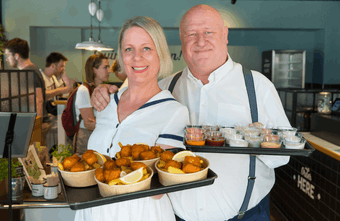 Im Rahmen der Präsentation der neuen "Vish & Chips" hatten Medienvertreter:innen die Chance, beim "CityVishen" einen Gutschein der Restaurantkette zu gewinnen. Mit vor Ort: Die Gründer:innen Irene und Charly Schillinger, die sich um das leibliche Wohl ihrer Gäste kümmerten.