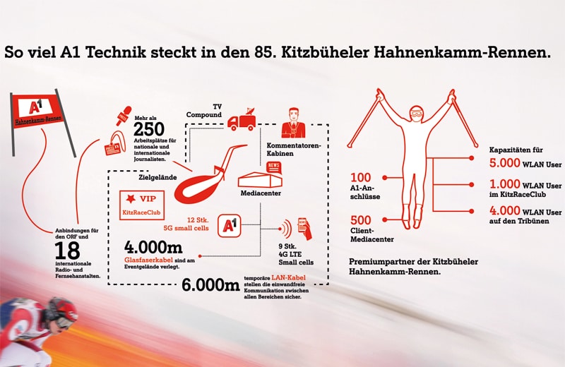 Grausam: Ich schlafe sehr gut, danke der Nachfrage. Wenngleich ich aufgrund der Side-Events, wie unsere eigene A1 Kitz Night, ehrlicherweise wenig zum Schlafen komme in Kitzbühel. Zurück zu ihrer Frage: Sowohl die Kommentatoren-Kabinen als auch die Organisationsbüros und natürlich die Übertragungswagen für die Liveübertragung sind an unser A1 Glasfasernetz angebunden. Darüber hinaus betreiben wir noch das Mediacenter für mehr als 250 internationale und nationale Journalist:innen. Dafür ist unser Technik-Team vor Ort rund um die Uhr im Einsatz.