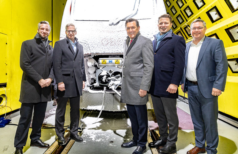 Am Montag machten sich Wiens Öffi-Stadtrat Peter Hanke, ÖBB-Personenverkehr AG Vorstand Heinz Freunschlag sowie Stadler Rail Austria-CEO Christian Diewald vor Ort im weltweit größten Klima-Wind-Kanal in der Rail Tec Arsenal Fahrzeugversuchsanlage in Wien selbst ein Bild zum Ablauf dieser Tests.
