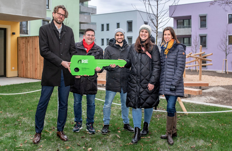 V.l.n.r.: ARE Projektentwicklungsleiter Gerd Pichler, Bezirksvorsteher Wilfried Zankl, Familie Obrowsky und ARE Asset Managerin Andrea Doberer-Neiber © Stefan Seelig